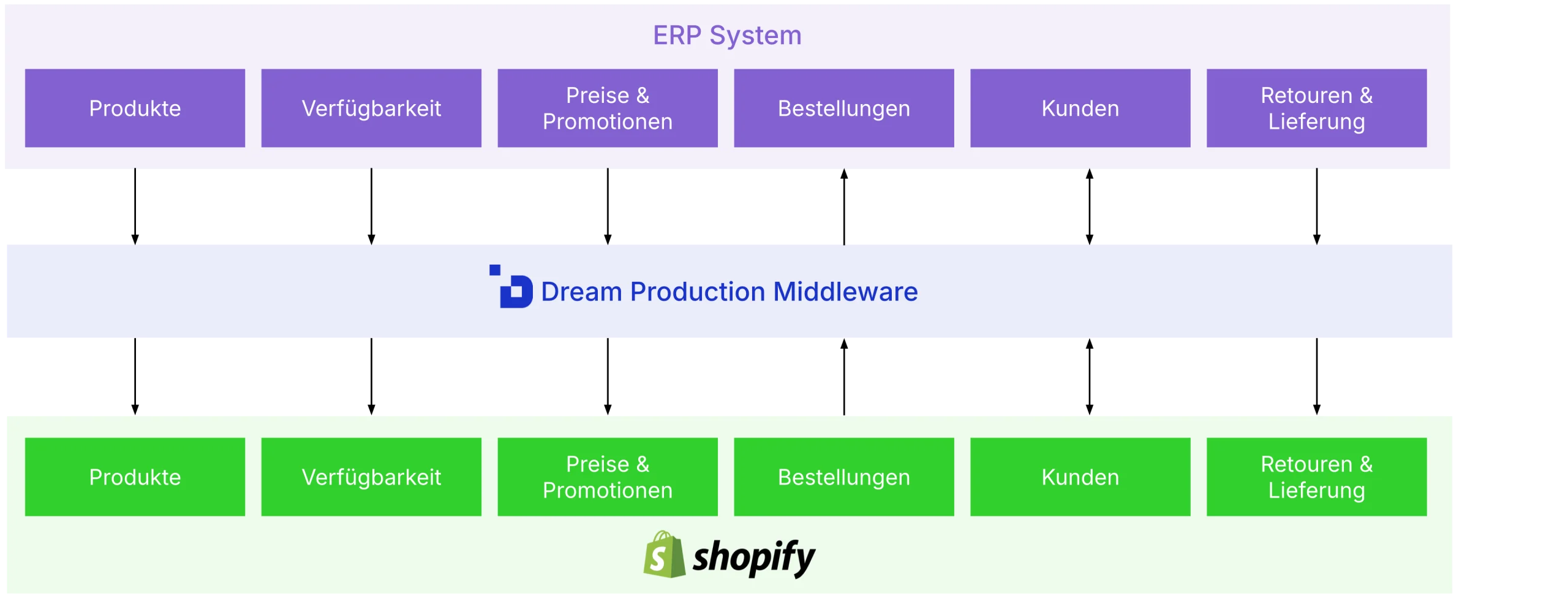 Dank unserer selbst entwickelten Middleware synchronisieren wir alle relevanten Datenströme zwischen Ihrem ERP und Shopify in Echtzeit: